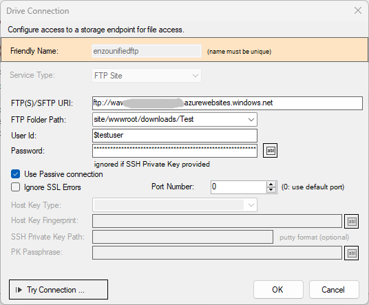 Enter the User ID and Password to use, and check the Use Passive Connection if needed.