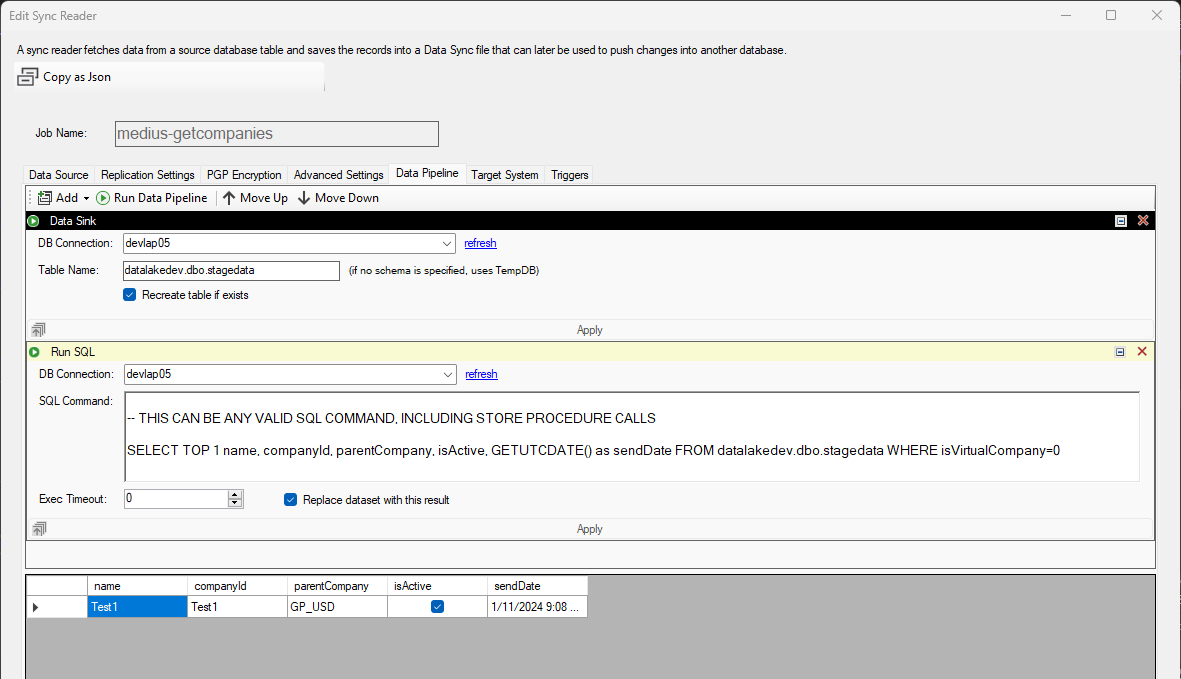 In this example, the Data Pipeline first sinks the data in a staging table (created automatically) called stagedata, then execute a custom SQL command to transform the data and select different columns. By choose the Replace dataset with this result option the Data Pipeline offers the ability to completely transform or replace the dataset sent to the target system.